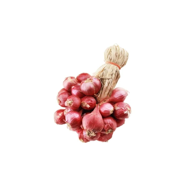 หอมแดงสดแบบมัด มีกลิ่นหอมอ่อน รสหวานเล็กน้อย และกรุบเบา ๆ เปลือกสีม่วงสดและเนื้อในสีขาวช่วยเพิ่มสีสันและรสชาติให้กับอาหาร เหมาะอย่างยิ่งสำหรับอาหารไทยและเอเชีย ใช้ได้ดีทั้งในเมนูผัด สลัด และตกแต่งจาน เพิ่มความหอมอร่อยให้ทั้งอาหารในบ้านและระดับร้านอาหาร